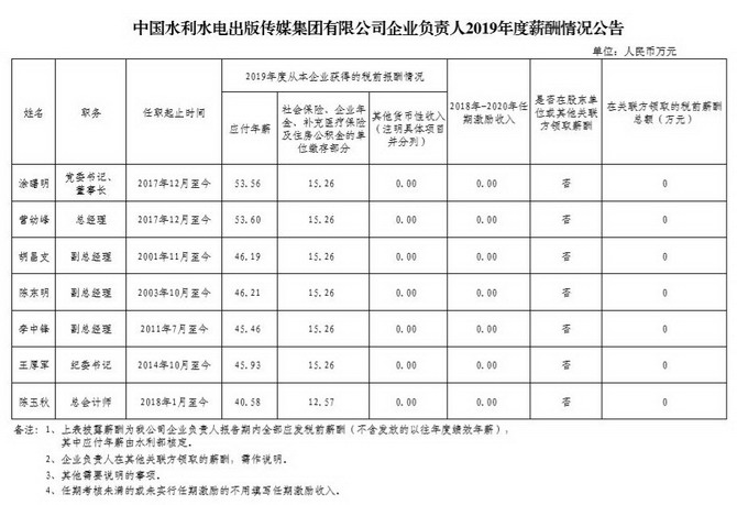 水電知識網(wǎng)»資訊»出版?zhèn)髅劫Y訊»中國水利水電出版?zhèn)髅郊瘓F有限公司企業(yè)負責(zé)人2019年度薪酬情況公告
