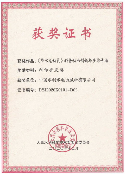 經大禹水利科學技術獎獎勵委員會審定、水利部批準,我社與江西省水利科學院聯合申報的 “《節水總動員》科普動畫創新與多維傳播”項目以科普組排名第一的成績喜獲大禹獎科學普及獎。